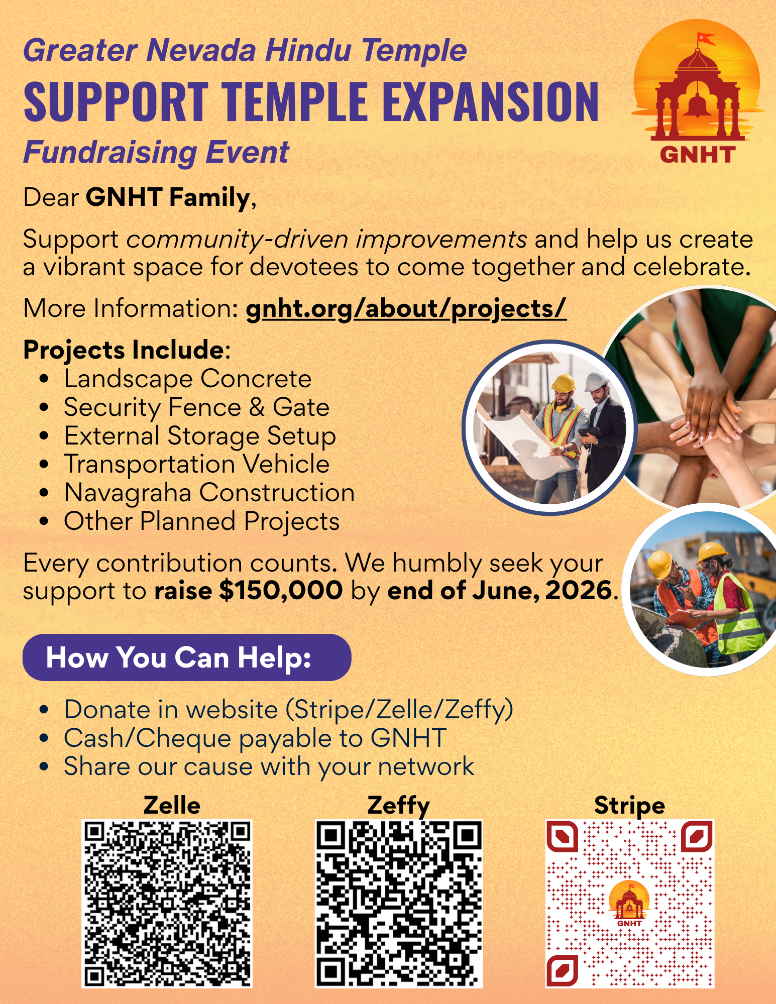 With the continued blessings and support from GNHT members and devotees, our temple has grown into a strong spiritual home for the Greater Reno community. As we move into the next phase of development, we invite you to join us in enhancing our temple facilities to better serve all devotees.